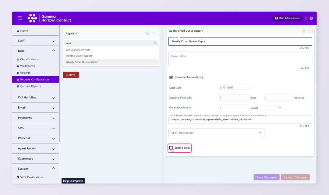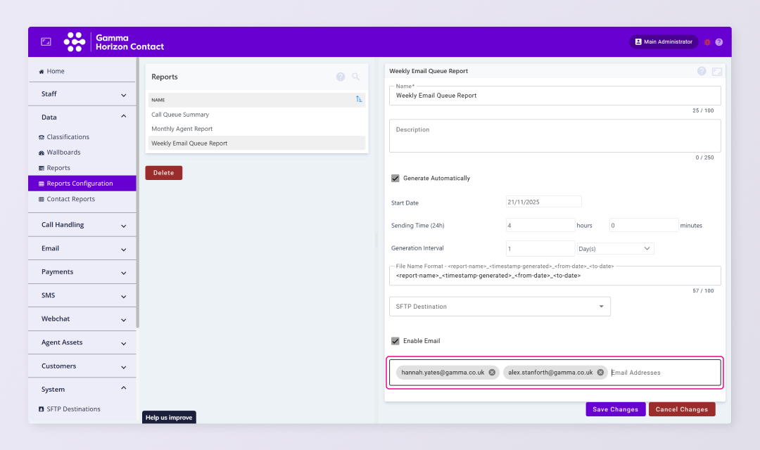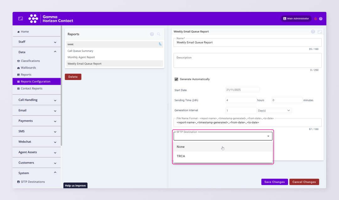 Once a data report has been created it’s possible to configure the report to be generated automatically at scheduled internals. The report can then be transferred to an external destination via SFTP and/or sent to an email address.